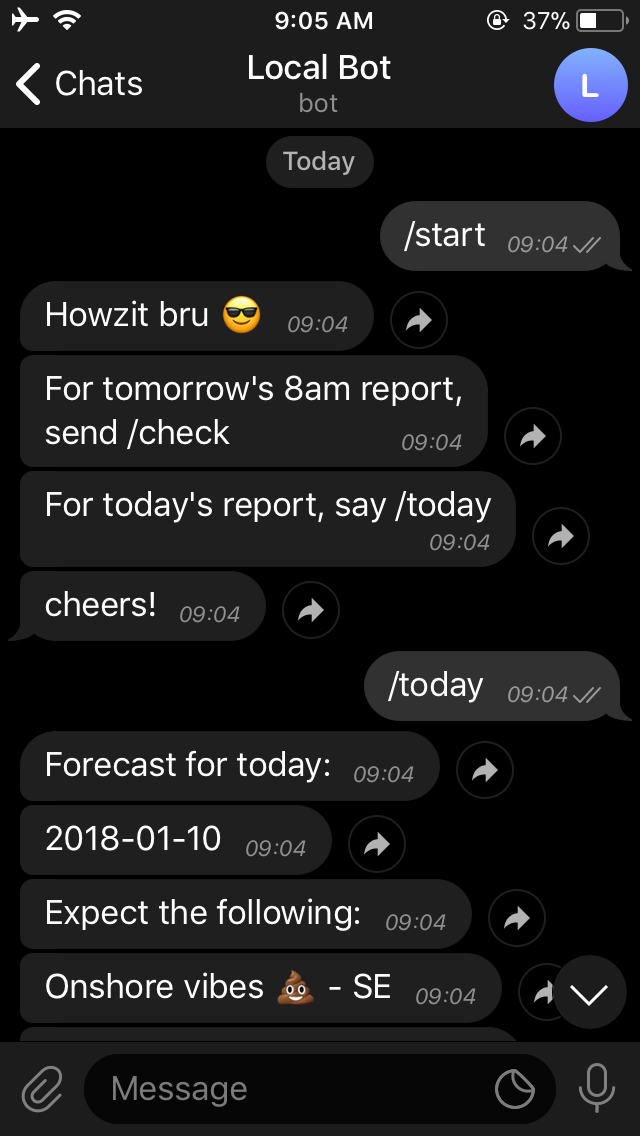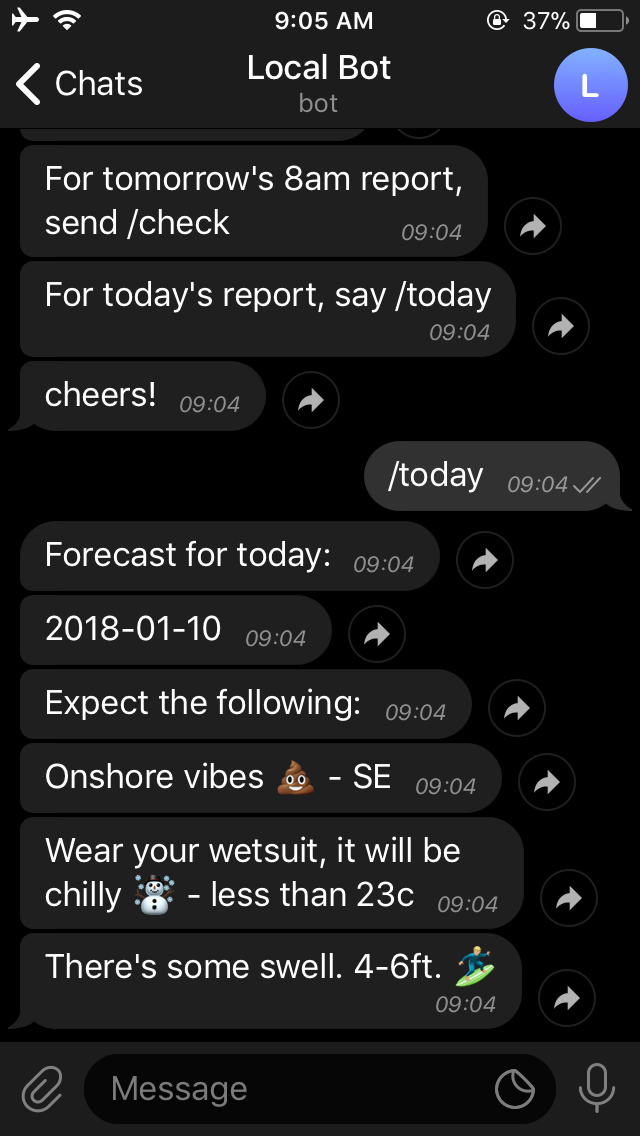 The friendly guys at Magicseaweed also hooked me up with an API so I can use it in bot. And now I can let me tell me the report for today and tomorrow on demand in human language.